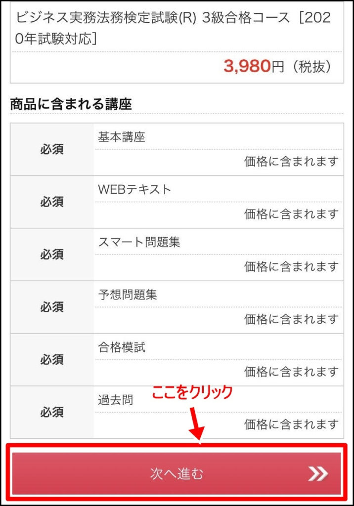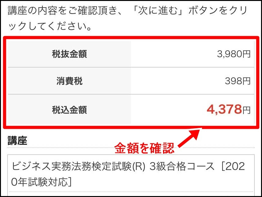 『次に進む』をクリックすると、講座の税込金額が表示された画面が出てきます。