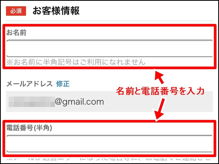 『次へ進む』をクリックすると、購入者の『お名前』と『電話番号』を入力する画面が出てきます。