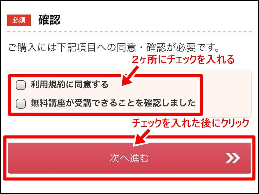 1番下までスクロールしたら、『利用規約に同意する』と『無料講座が受講できることを確認しました』の2ヶ所にチェックを入れて『次に進む』をクリックしてください。
