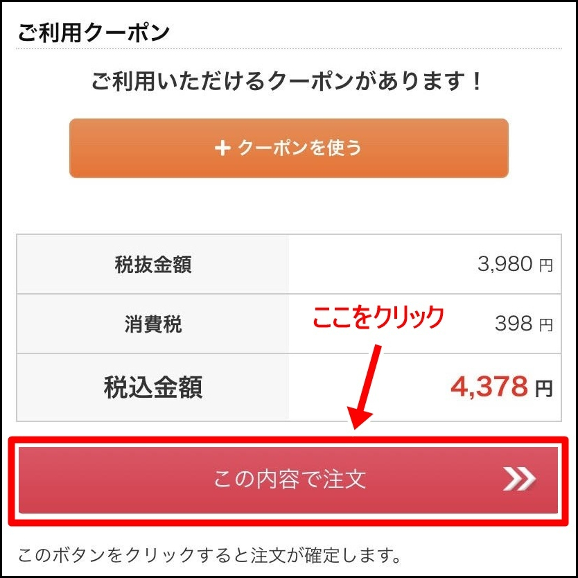 支払方法を選択して『次に進む』をクリックしたら、いよいよ最後のページです。金額に間違いがなければ『この内容で注文』をクリックしてください。