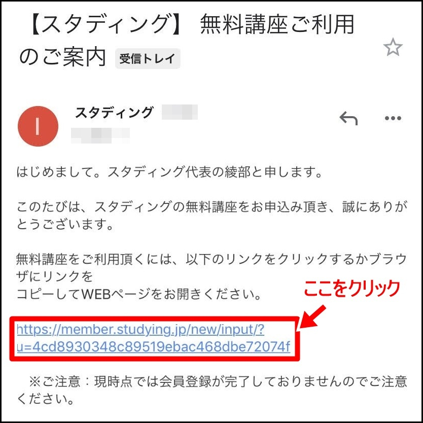 スタディングから届いたメールを開き、メールに記載されたリンクをクリックします。